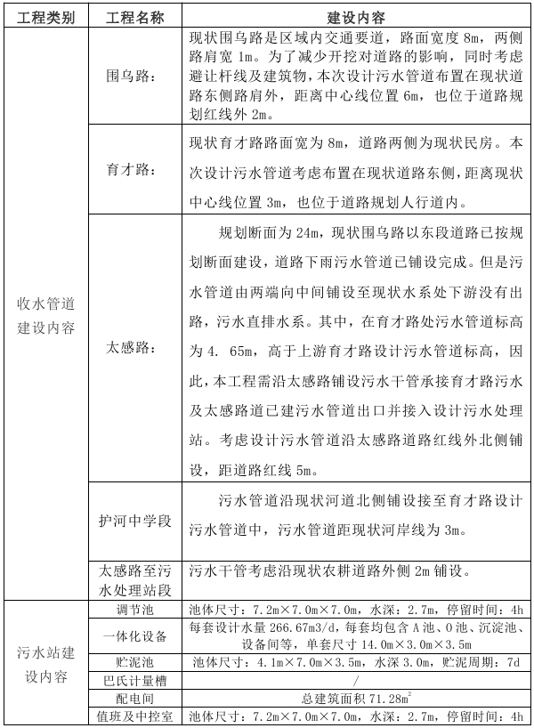 本項目新建汙(wū)水處(chù)理站一座,規(guī)模為800t/d。新建汙水管網5.75公裏,管(guǎn)徑(jìng)為DN400-DN600,采用開挖、牽引(yǐn)相結(jié)合的施工(gōng)方(fāng)式。建(jiàn)設(shè)項目工程組成見表1。
