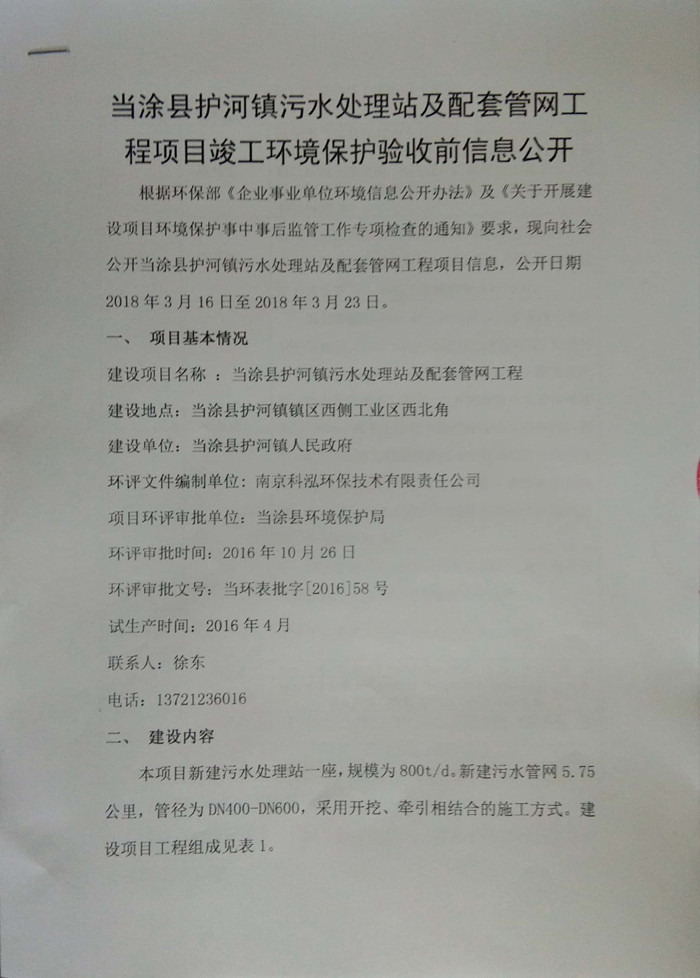 根據環保部《企業事業單位環境(jìng)信(xìn)息公(gōng)開辦(bàn)法》及《關於開展建設項目(mù)環境保護事中事後(hòu)監管工作專項檢查的(de)通知》要求,現(xiàn)向社會公開當塗縣(xiàn)護河(hé)鎮汙水處理站及配套管網工程項目信息,公開日期2018年3月16日至2018年3月(yuè)23日。