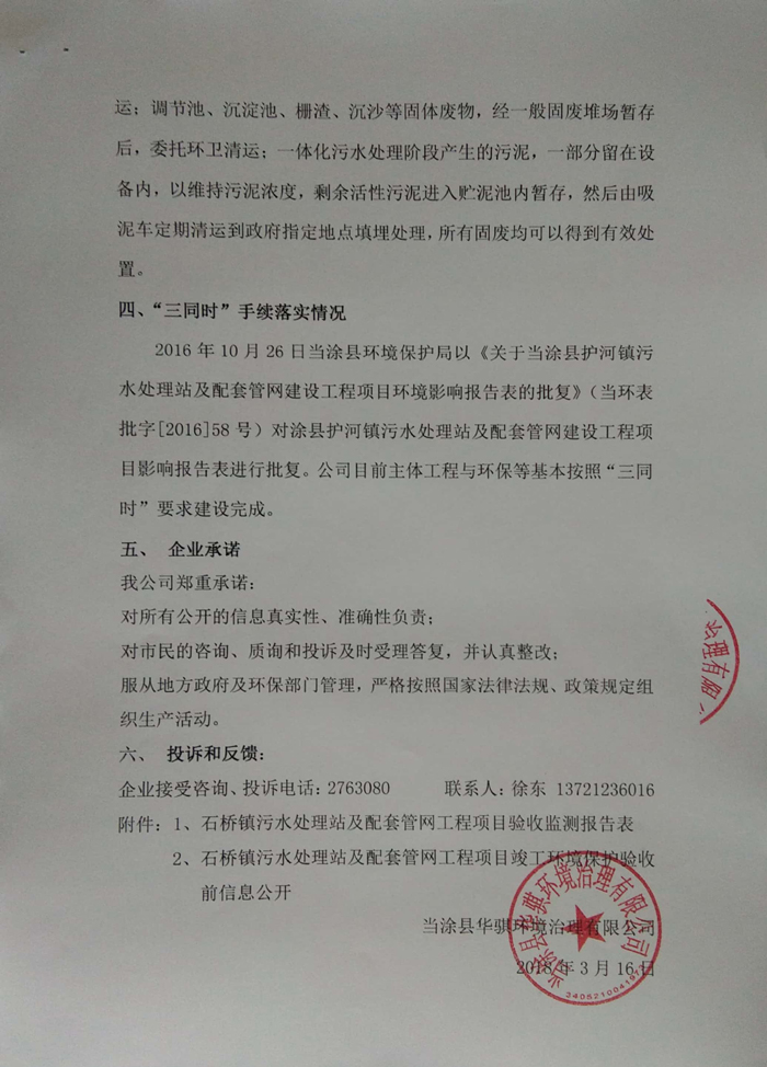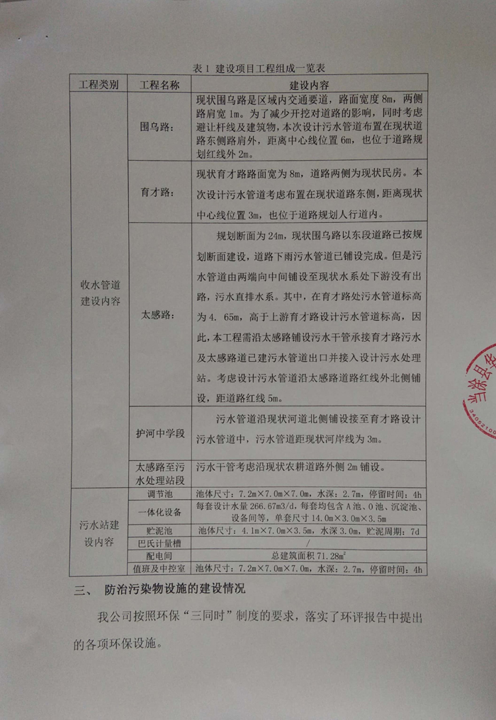 2016年10月26日當塗縣環境保護局(jú)以《關於當塗縣護河(hé)鎮汙水處理站(zhàn)及配(pèi)套管(guǎn)網建設工(gōng)程(chéng)項目環境影響報告表的批複》(當環表批字[2016]58號)對塗縣護河鎮汙(wū)水處理(lǐ)站及配套管網建設工程項目影響報告表進行批複。公司目前主(zhǔ)體(tǐ)工程與環保(bǎo)等基本(běn)按照“三同時”要求建設完成。