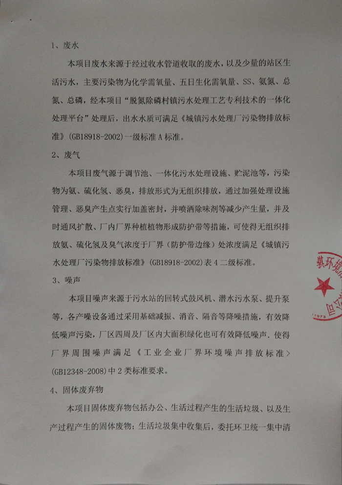 本項目廢水來源於經過收水管道收取的廢水(shuǐ),以及少量的站區生活汙(wū)水(shuǐ),主要汙染物為化學需氧(yǎng)量、五日生化需氧量(liàng)、SS、氨氮、總氮、總磷,經本項(xiàng)目“脫氮(dàn)除磷村鎮汙水處理工藝專利技(jì)術的一體化處理平台”處(chù)理(lǐ)後,出水水質可滿足《城(chéng)鎮汙水處理廠汙染物排放標準》(GB18918-2002)一級標準A標(biāo)準。