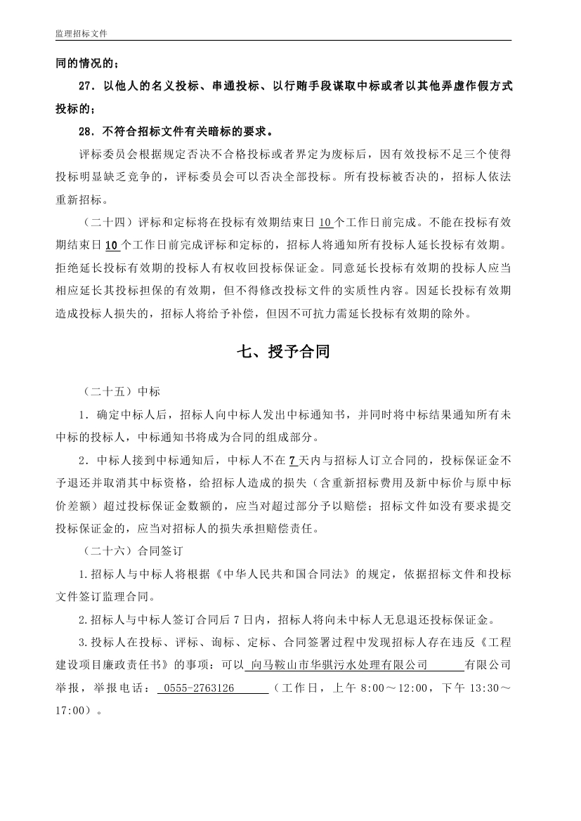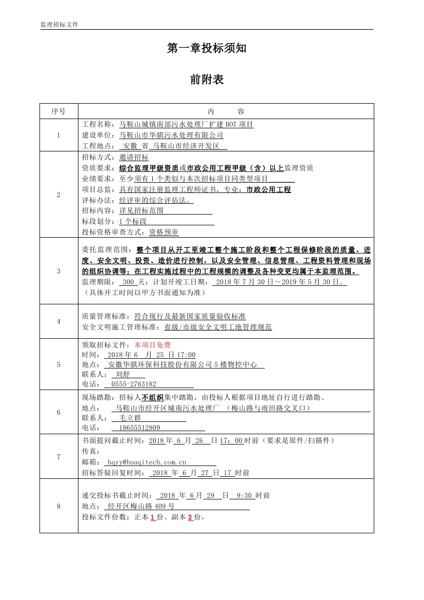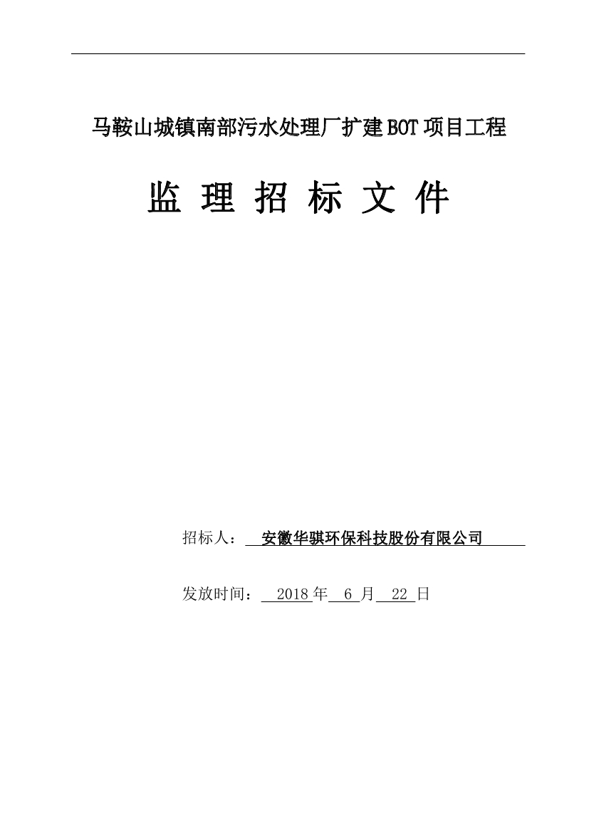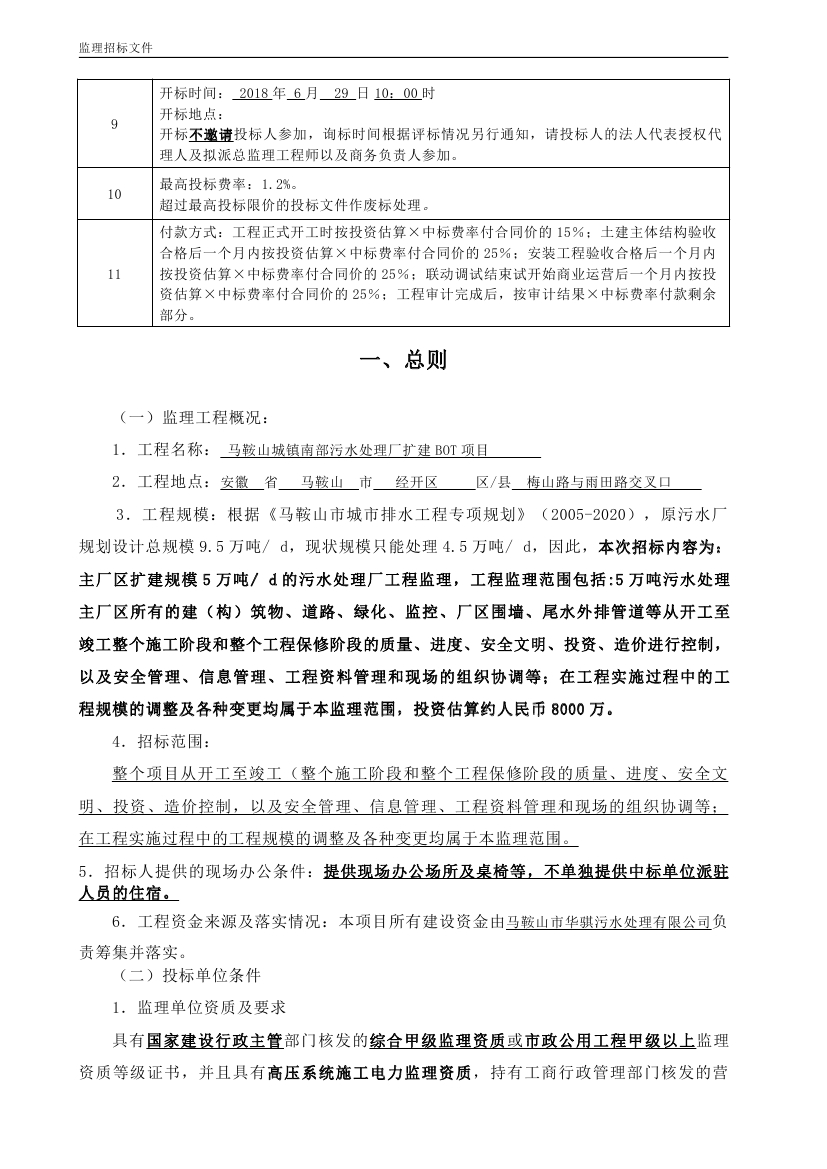 馬鞍(ān)山城鎮(zhèn)南部汙水處理廠擴建BOT項目工程監理(lǐ)招標文件