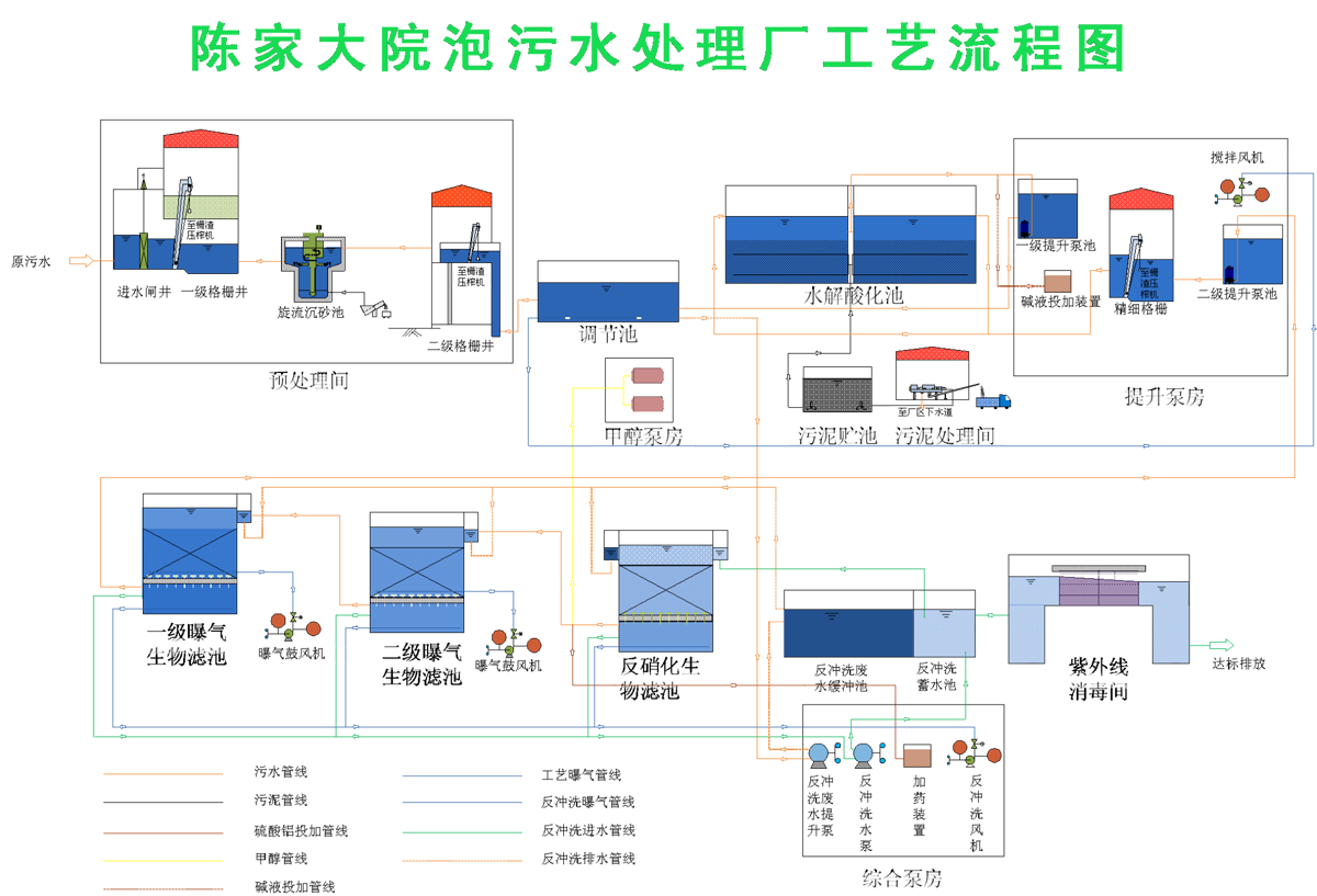 該汙水處理廠主體工藝由預處理間、調節(jiē)池、提升泵房、水解酸化池、一級曝氣生物濾池、二級曝氣生物濾池和反硝化生物濾池、紫外線消毒間等構(gòu)築物組成。其中曝氣生物濾池采用我公司專利技術(shù)“後置(zhì)反硝化脫氮工(gōng)藝”。出水水質可達到國家(jiā)《城鎮(zhèn)汙(wū)水處理廠汙染物排放標準》(GB18918-2002)中的一級A類標準。