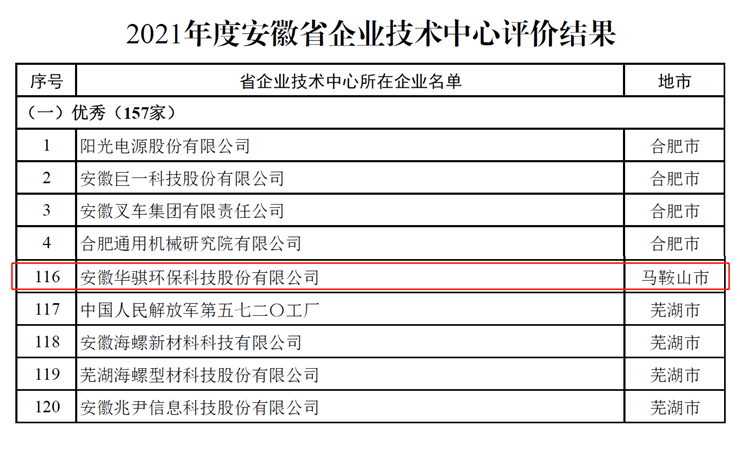 近日,安(ān)徽省經濟和信息化廳(tīng)發(fā)布《關於(yú)2021年度省企業技術中心評價結果的通知》,安徽華騏環保(bǎo)科技股份有限公司技術中心獲評“安徽省優秀企業技術中心(xīn)”。“優秀”是省企業中心評價的最高榮譽,本次全(quán)省共計1538家企(qǐ)業技術中(zhōng)心,經省經濟和信息化主管(guǎn)部門審查、第三方評價與最終審定,其中157家省級企業技術中心評價為優秀,753家(jiā)為良好,537為合格,91家為不合格且撤銷省(shěng)企業技術中心資(zī)格。獲評優秀企業技術中心在產品創新、工藝創新、商業模式創新、產學研合作及創新成果等方麵做出鮮明(míng)特色,並獲得優(yōu)異(yì)成果,對全省技術中心建設具有引領(lǐng)示範作用。