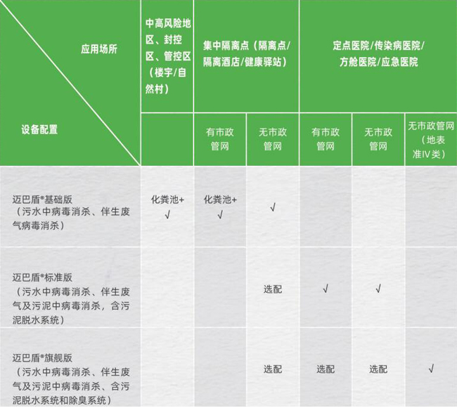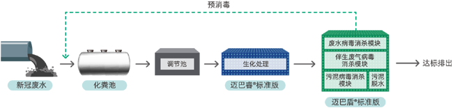 在(zài)邁巴盾®基礎版上增加了伴生廢氣中氣溶(róng)膠病毒(dú)和伴(bàn)生汙泥中病毒的全麵消殺,並(bìng)包含汙泥脫水係統。消殺後相(xiàng)關指標可達到《醫療機構水汙染物排放標準》(GB18466-2005)要求及《醫學隔離觀察設施設(shè)計(jì)標準》和《新型冠狀病毒感(gǎn)染的肺炎傳染病應急醫療設施設計標準》(T/CECS661-2020)。