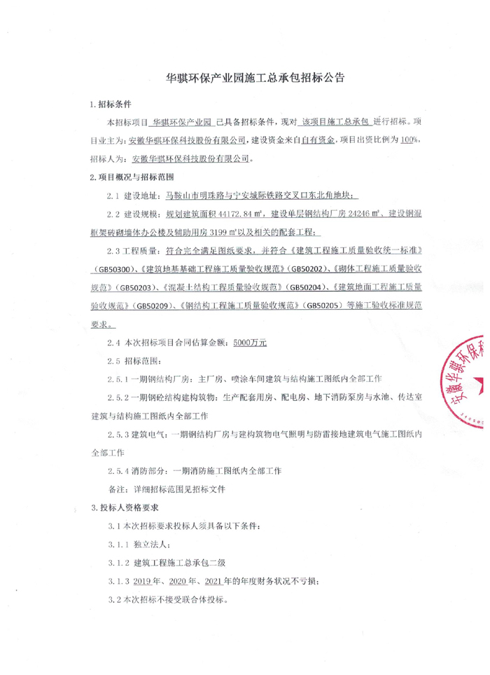 本招標項(xiàng)目 華騏(qí)環保產業園 已具備(bèi)招標條件,現對(duì) 該項(xiàng)目施工總承包 進行招標。項目業主為:安徽華騏環保科技股份有限(xiàn)公司,建設資金來自自有資金,項目出資比(bǐ)例為100%,招標人為:安徽華騏環保科(kē)技股份(fèn)有(yǒu)限公司。