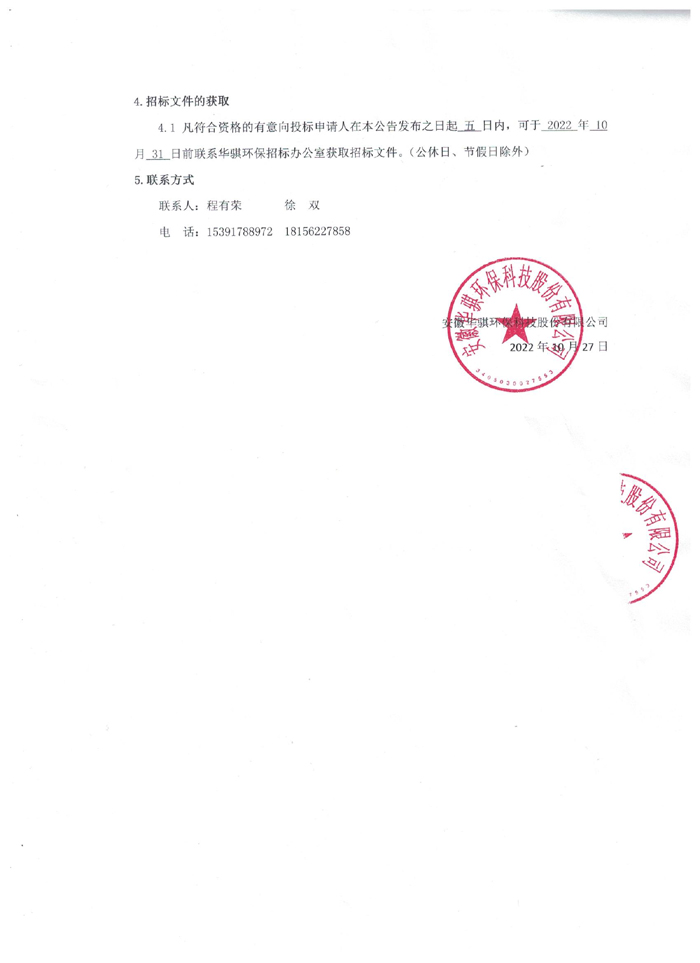 4.1 凡符合資(zī)格的有意向投標(biāo)申請人(rén)在本公告發布之日起 五 日內,可(kě)於 2022 年 10 月 31 日前聯係華騏環保招標辦公室獲取招標文件。(公休(xiū)日、節假日除外)