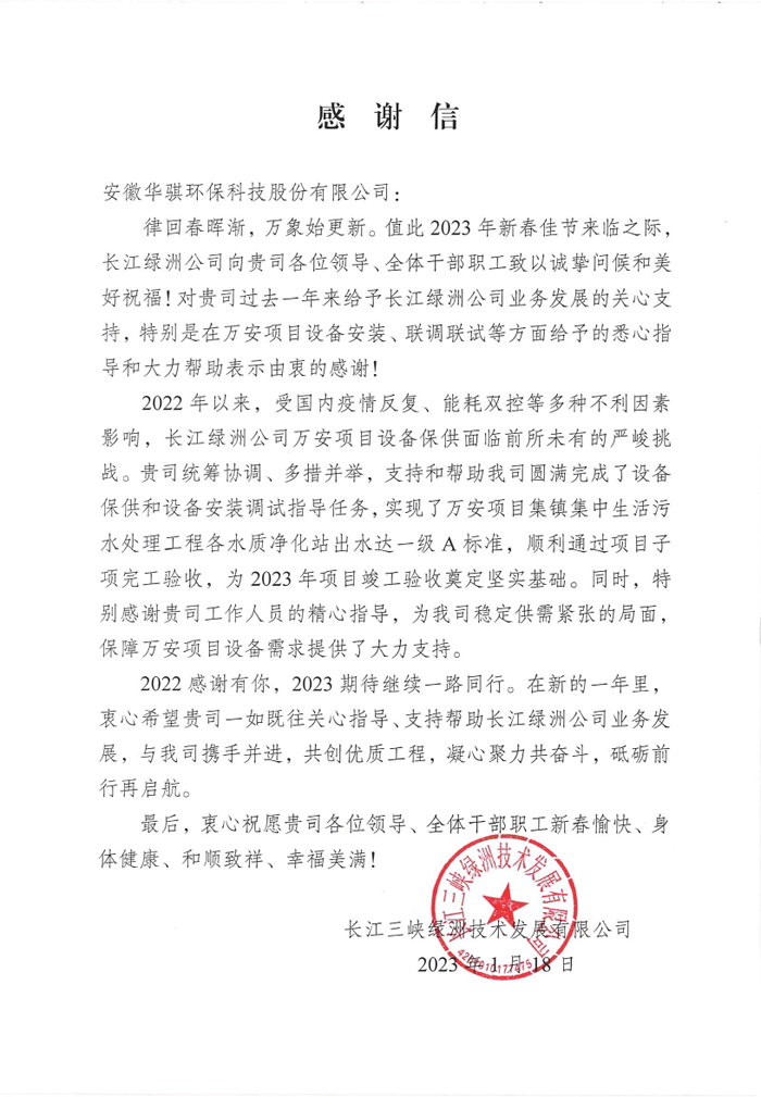 感謝信寫道:“2022 年以來,受國內(nèi)疫情(qíng)反複、能耗雙控等多(duō)種不利因素影響,長(zhǎng)江綠洲(zhōu)公(gōng)司(sī)萬安項目設備(bèi)保供麵臨前所未有的嚴峻挑(tiāo)戰。華騏環(huán)保統籌協調、多措並舉,支持和幫助我司圓滿完成了設備保供和設備安裝調試指導任務,實現了萬安項目集鎮集中生活汙水處理工程各水質淨化站出水達一級 A 標(biāo)準,順利通過項目子項完工驗收,為 2023 年項目竣工驗收(shōu)奠定堅實基礎。同(tóng)時,特別感謝(xiè)貴司工作人員的精(jīng)心指導,為我司穩定供需緊張的局麵保障萬安項目設備需求(qiú)提供了大力支(zhī)持。”