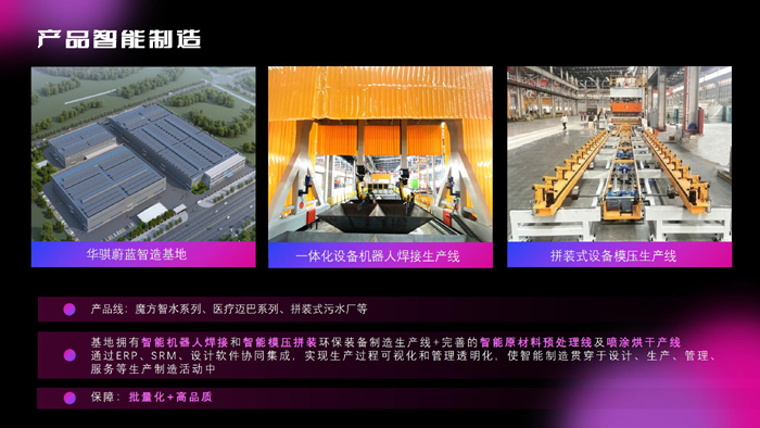 華騏環保旗下的蔚藍智能(néng)裝備製造基地,擁有包括魔方智水係列、拚裝式(shì)汙水廠係列、醫療邁巴係列、精細格柵係列等多條產品線。