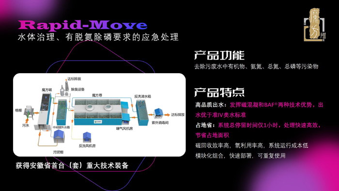 如遇同時要(yào)求脫氮除磷的提質增效或應急處理項目,可選用由魔方(fāng)磁和魔方尊組合成的“Rapid-Move”係統,該係統曾獲(huò)得安徽省首(shǒu)台(套)重大技術裝備,其發揮了磁混凝和BAF兩(liǎng)種技術優勢——係統總停留時間僅1小時,占地麵積省;出(chū)水水質為準四類標準;模塊化組合,快速部署,可重(chóng)複利用。