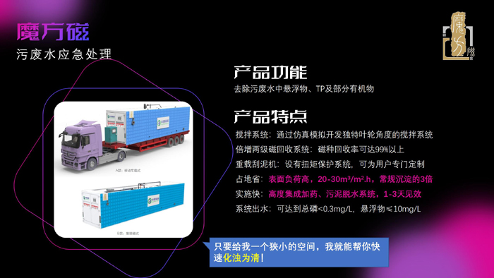 狹小空間亦可快(kuài)速化(huà)濁為清——針對水體(tǐ)治理,以及汙水處理廠、工業廢水廠應急處理場景,要求快速解決汙水感(gǎn)官問題,以及去(qù)除TP的情況下(xià),可以選用魔方智水的魔方磁,其功能是去除SS和TP,它(tā)有車載式和集裝箱式兩(liǎng)種形式(shì),采用(yòng)磁加載混凝澄清技術,表麵麵負荷 20 以上、停留時間是常規沉澱技術的 1/3-1/4,占地小,處理效率高(gāo)。高度集成了加藥、汙泥脫水以及控製係統,快速部署,快(kuài)則1天,慢則3天就(jiù)即可見效,處理效果立竿見影。