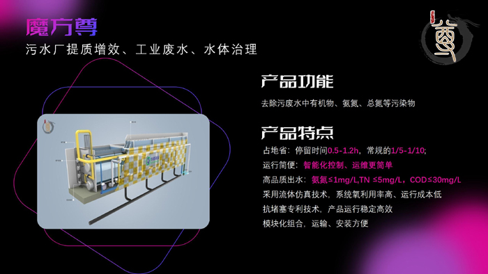 針對汙水廠提質增效、工業廢水(shuǐ)、水體治理場景(jǐng)中水質要求高、可(kě)用麵積小、運行專業性弱的三個痛點,華騏(qí)環保量身定製了魔方尊,它采用(yòng)曝氣(qì)生物濾池工藝(yì)技術,該技術先後獲(huò)得了國家科學技術發明二等獎和環(huán)境保護科學技術一等獎。魔方尊(zūn)占地省,僅為常規工(gōng)藝的1/3;停留時間一般在0.5-2h,結合智能運(yùn)維決策係統,更懂(dǒng)用戶,運行更智能;出水氨氮≤1mg/L,COD≤30mg/L,TN ≤5mg/L,高品質出水。