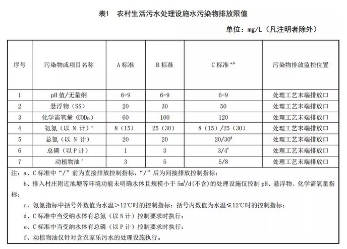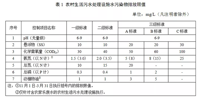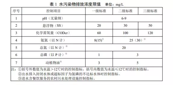 2.自本標準實施之日起,新(xīn)(改、擴)建處理能力在500m3/d以下的農村生活汙水處理設施排水汙(wū)染物最(zuì)高允許排放濃度限值按表1規定執行。